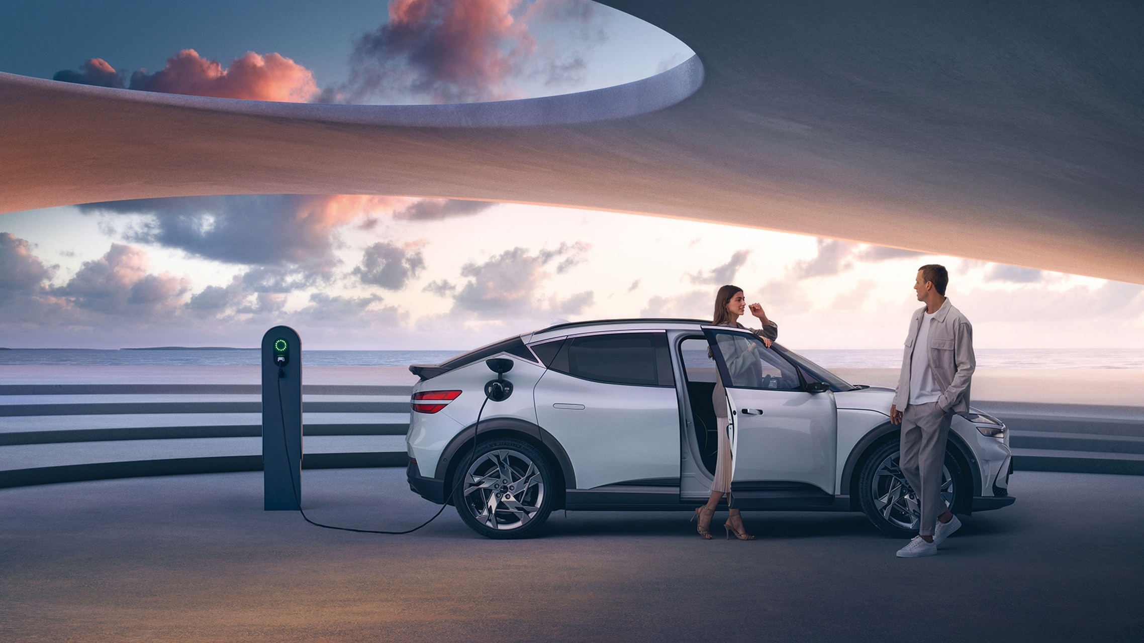역시 E-GMP 플랫폼을 적용한 것으로 인해 아이오닉5, EV6 등과 같이 굉장히 긴 휠베이스로 앞 뒤 오버행이 짧지만 실내 공간을 최대로 넓게 구성했을 것으로 확인된다. 다만 도어 상단에서 리어까지 이어지는 크롬 장식이 C필러 부분에서 전기차를 상징한다는 형태로 마치 알파벳 V처럼 보이는 모양으로 적용된 것은 호불호가 많이 갈릴 것으로 예상된다. 휠은 19, 20, 21인치 총 3가지 형태로 구성되었으며 21인치는 퍼포먼스 AWD 전용으로 적용되었다.