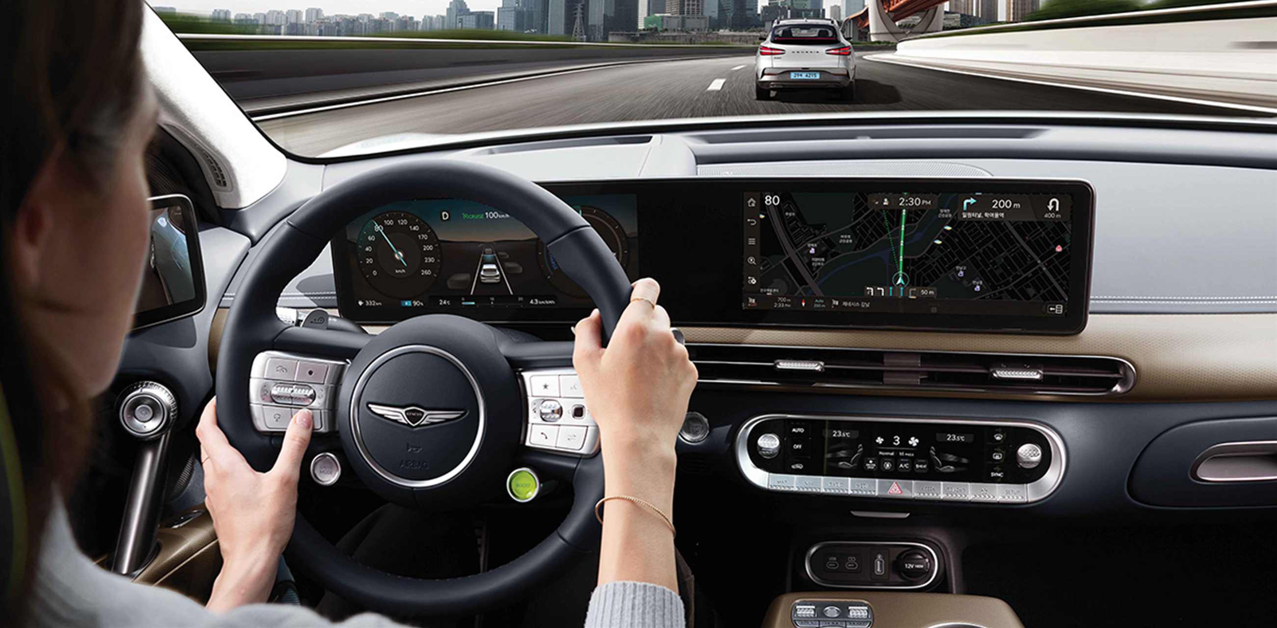 둥근 형태의 요소들을 곳곳에서 확인할 수 있으며 약간 컴팩트 SUV 같은 느낌의 디자인이 다소 제네시스 같이 않은 느낌을 주는 것이 사실이다. 계기판 디스플레이는 센터 디스플레이와 일체형으로 구성되었으며 요즘 유행처럼 적용하고 있는 디스플레이들과 크게 다르지 않다. 옵션 선택을 통해 디지털 사이드 미러를 적용하면 좌우측 패널을 통해 사이드 미러를 확인할 수 있으며 시트는 스탠다드 트림 시 기본사양으로는 인조 가죽 시트가 적용되어 있어 천연가죽 시트를 적용하려면 150만원의 시그치쳐 디자인 섹렉션1을 선택해야 한다.
