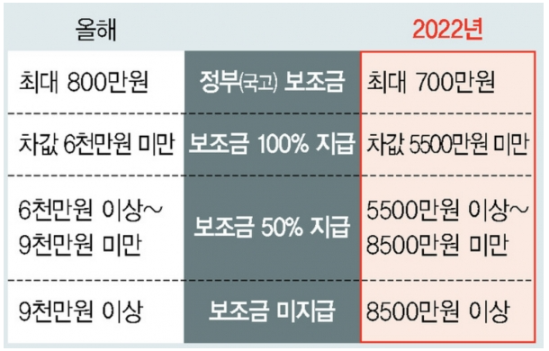 2021년에는 최대 800만원이었던 국고 보조금이 2022년에는 700만원으로 삭감된다. 또한 최대 금액인 700만원을 100% 지급 받으려면 차량 금액은 5,500만원 미만이어야 하고, 5,500만원 이상 8,500만원 미만의 경우에는 50%를 지급받을 수 있으며 8,500만원 이상일 경우에는 보조금을 지급받을 수 없게 된다.